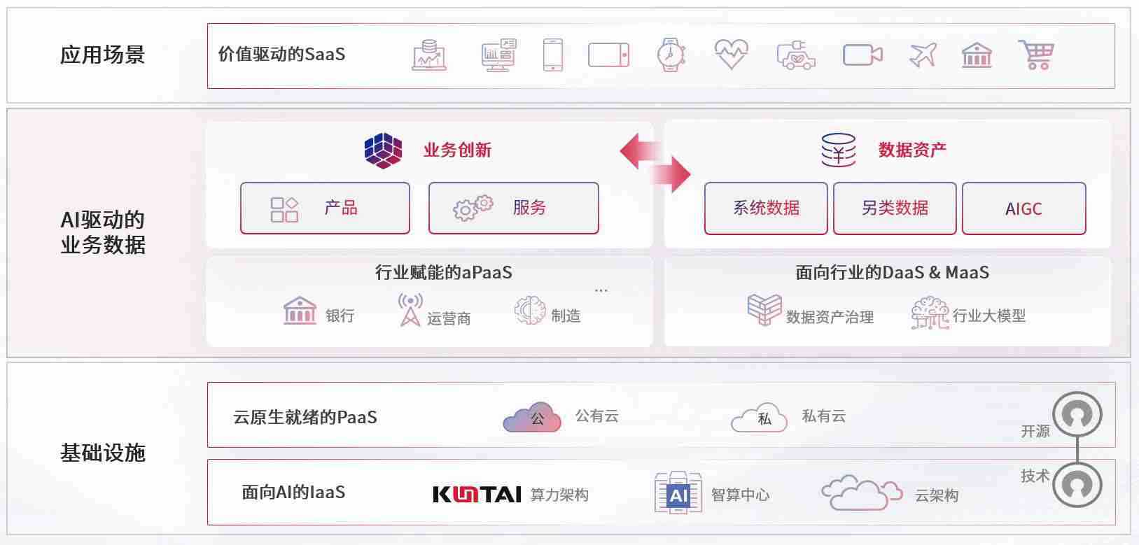 数字时代,,围绕企业数字化转型的关键要素,,,伟德bv1946数码开创性的提出数云融合战略和技术体系框架,,,,着力在云原生、、、、数字原生、、AI原生和信创产业上架构产品和服务能力,,,,为处在不同数字化转型阶段的快消零售、、汽车、、、、金融、、、医疗、、、、政企、、教育、、运营商等行业客户提供泛在的敏捷IT能力和融合的数据驱动能力,,,构建跨界融合创新的数字业务场景和新业务模式,,,助力企业级客户建立面向未来的核心能力和竞争优势,,全面推动社会的数字化、、智能化转型升级。。。。