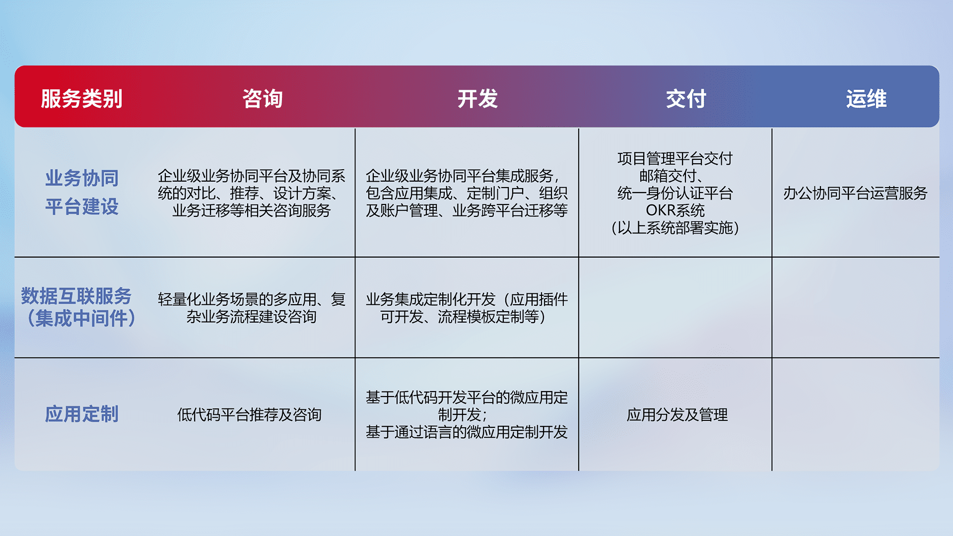 针对钉钉、、、、企微、、、IDaas等平台级产品提供产品的规划、、、、方案、、、交付、、定制化开发等服务,,,,实现如统一协同办公、、智能客户服务、、、混合会议管理、、、智能数据查询、、、等业务场景,,,,实现数字化转型。。。